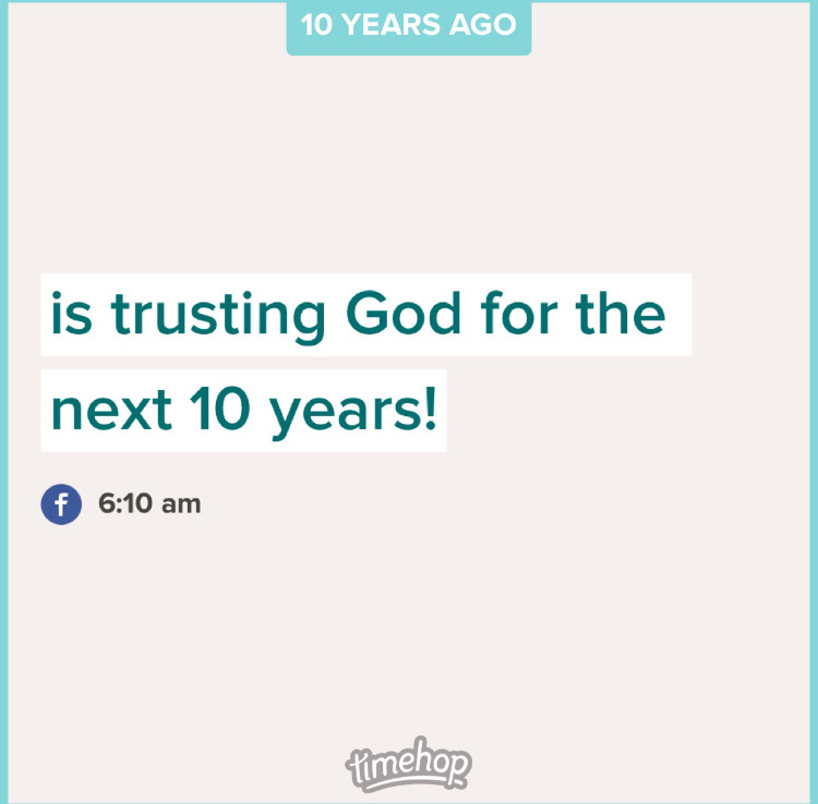 So TimeHop, I know 10 years from now, this post is going to come up on my screen (or whatever we have then). Another gentle reminder to keep trusting God for the next 10…